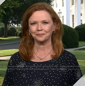 on Today on NBC was spotted wearing this navy dot print top on Today on Jul 26 2023's episode. 's Top is the Circle Pattern Bell Sleeve Top by Ann Taylor.