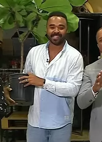 on Today on NBC was spotted wearing this blue striped shirt on Today on Jul 26 2023's episode. 's Shirt is the Relaxed Fit Lightweight Mixed Chambray Shirt in Sea Blue by Scotch & Soda.