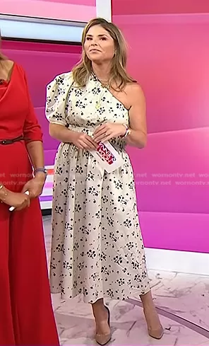 Jenna Bush Hager on Today on NBC was spotted wearing this ivory floral one-shoulder dress on Today on Jul 26 2023's episode. Jenna's Dress is the Floral One Shoulder Poplin Midi Dress by Polo Ralph Lauren.