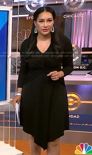 Morgan Radford on NBC News Daily on NBC was spotted wearing this black twisted waist dress on NBC News Daily on Nov 17 2023's episode. Morgan's Dress is the Surplice Jersey Dress by Ralph Lauren.