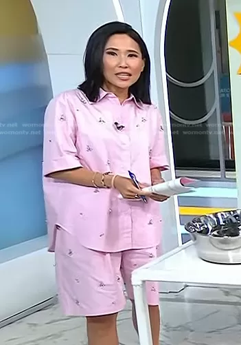 Vicky Nguyen on Today on NBC was spotted wearing this pink embellished short sleeve shirt and shorts on Today on Jul 26 2023's episode. Vicky's Top is the Jewel Poplin Shirt by Zara