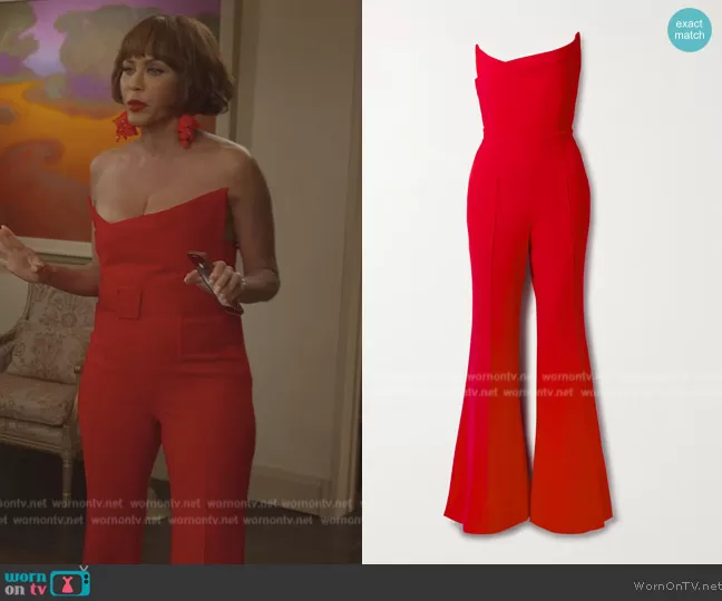 Lisa Todd Wexley (played by Nicole Ari Parker) on And Just Like That on HBO was spotted wearing this Lisa red strapless jumpsuit on And Just Like That on episode 'February 14th' (2x07) in Jul 2023. Lisa's Jumpsuit is the Strapless asymmetric wool-crepe jumpsuit by Roland Mouret . Lisa's Earrings is the Large Impatiens Clip On Earrings by Oscar De La Renta.