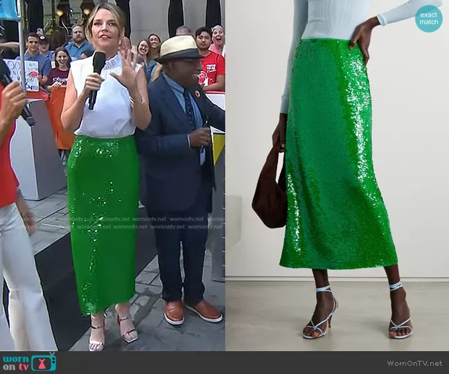 Savannah Guthrie on Today on NBC was spotted wearing this white pinstripe top and green sequin skirt on Today on Jul 27 2023's episode. Savannah's Top is the Skinner Ruffle-Trim Top by G. Label . Savannah's Skirt is the Sequined Stretch-Mesh Maxi Skirt by Tory Burch . Savannah's Shoes is the 85 Metallic Leather Sandals by Gianvito Rossi.