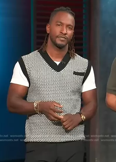 Scott Evans on Access Hollywood on NBC was spotted wearing this v-neck vest on Access Hollywood on Aug 29 2023's episode. Scott's Vest is the Roy Cotton Regular Fit V Neck Sweater Vest by Helmut Lang.