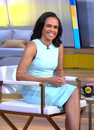 Linsey Davis on Good Morning America on ABC was spotted wearing this light blue leather dress on Good Morning America on Jul 27 2023's episode. Linsey's Dress is the Delora Faux Leather Dress in Julep by Alice + Olivia.