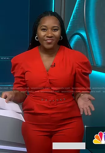 Kay Angrum on NBC News Daily on NBC was spotted wearing this red belted jumpsuit on NBC News Daily on Jul 27 2023's episode. Kay's Jumpsuit is the Lena Puff Sleeve Self-Belt Jumpsuit by New York & Company.