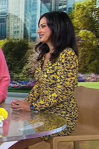 on Today on NBC was spotted wearing this Tara Narula’s yellow floral ruched dress on Today on Jul 28 2023's episode. 's Dress is the Floral Print Mesh Dress by Ganni.