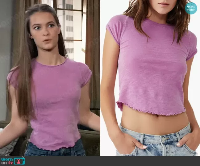 Esme (played by Avery Kristen Pohl) on General Hospital on ABC was spotted wearing this lilac tee on General Hospital on Jul 29 2023's episode. Esme's Top is the Be My Baby T-shirt in Summer Tulips by Free People.