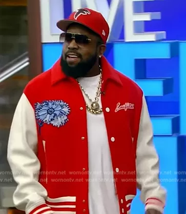 on Live with Kelly and Mark on Disney ABC Home Entertainment was spotted wearing this red varsity jacket on Live with Kelly and Mark on Jul 29 2023's episode. 's Jacket is the Psychedelic Flower Embroidered Varsity Blouson by Louis Vuitton.