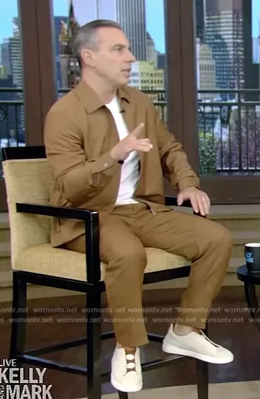 on Live with Kelly and Mark on Disney ABC Home Entertainment was spotted wearing this white and brown sneakers on Live with Kelly and Mark on Jul 31 2023's episode. 's Shoes is the Mixed Cotton Triple Stitch Sneakers by Zegna.