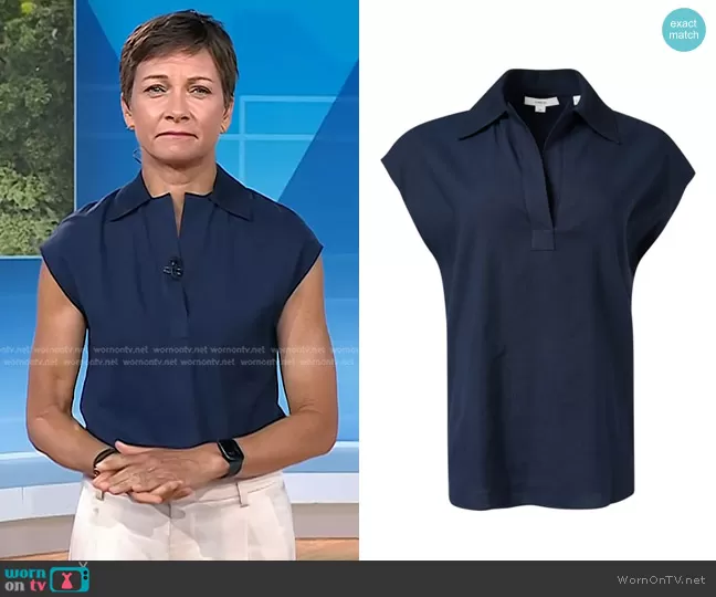 Stephanie Gosk on Today on NBC was spotted wearing this navy short sleeve top on Today on Jun 28 2024's episode. Stephanie's Top is the Linen Blend Popover Top by Vince.