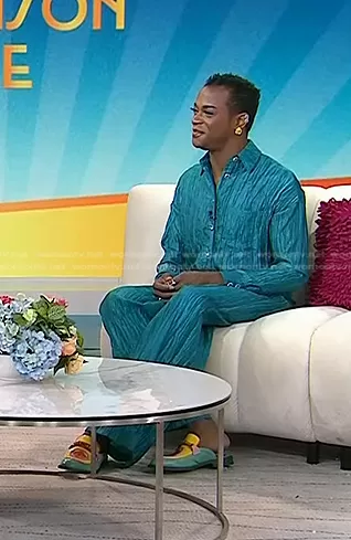 on Today on NBC was spotted wearing this teal pleated jumpsuit on Today on Jul 31 2023's episode. 's Jumpsuit is the Signature Tie Front Jumpsuit by Izayla . 's Shoes is the Futuro Optimisto Memphis Leather Mules by Casablanca.
