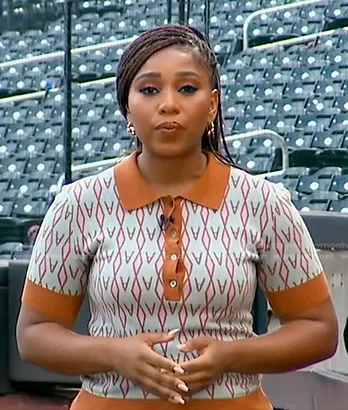 on Good Morning America on ABC was spotted wearing this blue geometric knit polo on Good Morning America on Jul 29 2023's episode. 's Top is the Andie Top by Aknvas.