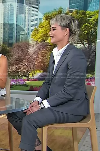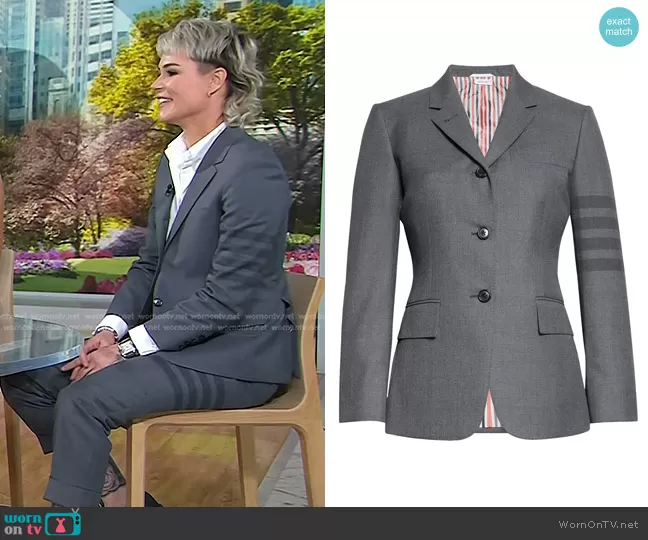 on Today on NBC was spotted wearing this grey striped blazer and pants on Today on Aug 01 2023's episode. 's Jacket is the 4-Bar Wool Gabardine Blazer by Thom Browne . 's Pants is the 4-Bar Cropped Wool & Cashmere Pants by Thom Browne.