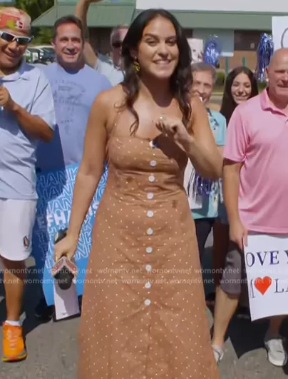 Donna Farizan on Today on NBC was spotted wearing this brown polka dot dress on Today on Sep 09 2023's episode. Donna's Dress is the Halter Button Up Midi Dress by We Wore What.