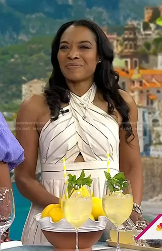 on Today on NBC was spotted wearing this white striped halter dress on Today on Aug 01 2023's episode. 's Dress is the Rhapsody Poplin Maxi Dress by Banana Republic.