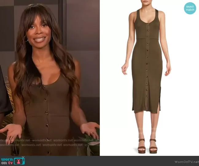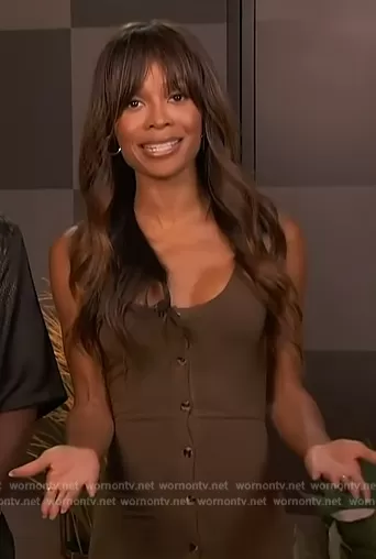 Zuri Hall on Access Hollywood on NBC was spotted wearing this brown button front dress on Access Hollywood on Aug 01 2023's episode. Zuri's Dress is the Sleeveless Button Down Midi Dress by Good American.