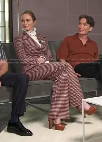 on E! News on E! was spotted wearing this brown and pink check blazer and pants on E! News on Jul 18 2023's episode. 's Jacket is the Graphic-Print Single-Breasted Blazer by Moschino . 's Pants is the Graphic-Print Flared Trousers by Moschino.
