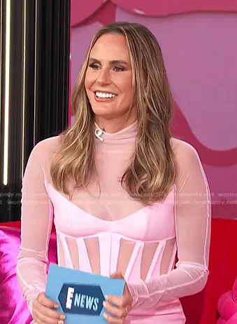Keltie Knight on E! News on E! was spotted wearing this pink corset mesh dress on E! News on Jul 20 2023's episode. Keltie's Dress is the Long Sleeve Mesh Corset Dress by Mugler.