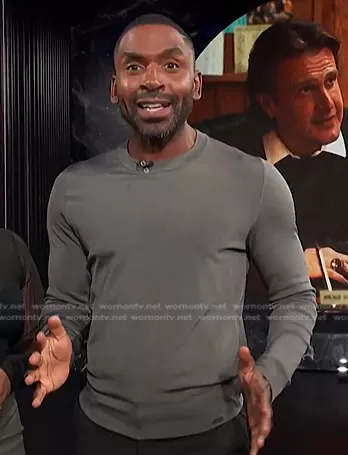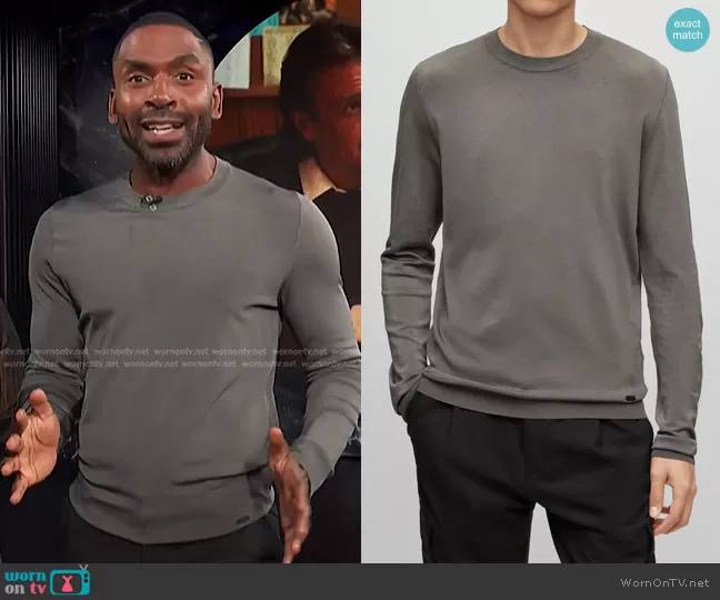 Justin Sylvester on E! News on E! was spotted wearing this grey crew neck sweater on E! News on Oct 11 2023's episode. Justin's Sweater is the Regular Fit Sweater with Metal Logo by Hugo Boss.