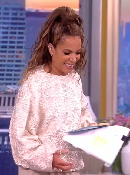 Sunny Hostin on The View on ABC was spotted wearing this floral metallic blouse on The View on Aug 02 2023's episode. Sunny's Top is the Capo Floral Silk Jacquard Blouse by Dries Van Noten.