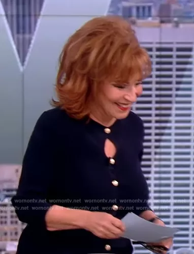 Joy Behar on The View on ABC was spotted wearing this navy keyhole cardigan on The View on Oct 18 2023's episode. Joy's Sweater is the The Mara Keyhole Cardigan by Elie Tahari.