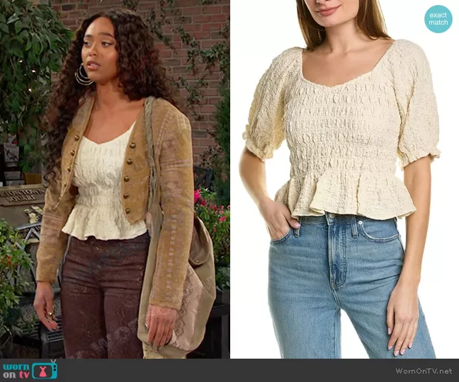 Talia Hunter (played by Aketra Sevellian) on Days of our Lives on Peacock was spotted wearing this white textured top and brown jacket on Days of our Lives on Aug 03 2023's episode. Talia's Top is the Leelee Top by Saltwater Luxe . Talia's Jacket is the Juliette Cropped Jacket by Free People . Talia's Bag is the Light My Fire Tote by Free People.