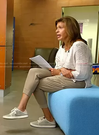 Hoda Kotb on Today on NBC was spotted wearing this white crochet sweater and sneakers on Today on Aug 02 2023's episode. Hoda's Sweater is the Knit Lightweight Sweater by Fate . Hoda's Shoes is the Pehuea Li Casual Shoes by OluKai.