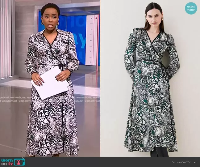 Zinhle Essamuah on NBC News Daily on NBC was spotted wearing this green animal print wrap dress on NBC News on Dec 08 2025's episode. Zinhle's Dress is the Animal Satin Twill Wrap Midi Dress by Karen Millen.