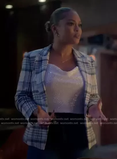 (played by Latto) on Grown-ish on Freeform was spotted wearing this blue plaid blazer on Grown-ish on episode 'Savior Complex' (6x06) in Aug 2023. 's Blazer is the Ralph Plaid Single-Breasted Jacket by Derek Lam 10 Crosby.