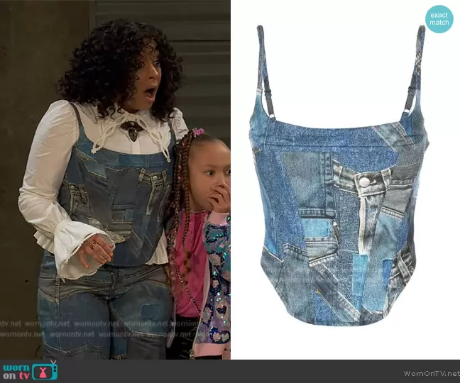 Raven Baxter (played by Raven-Symoné) on Ravens Home on Disney was spotted wearing this denim corset top and jeans on Ravens Home on episode 'Working for the Weeknd' (6x12) in Jul 2023. Raven's Top is the Venus Corset by Miaou . Raven's Pants is the Atlas Pant by Miaou.