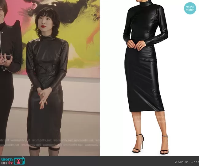 (played by Daphne Zelle) on And Just Like That on HBO was spotted wearing this black leather midi dress on And Just Like That on episode 'A Hundred Years Ago' (2x08) in Aug 2023. 's Dress is the Delora Mock Neck Dress by Alice + Olivia.