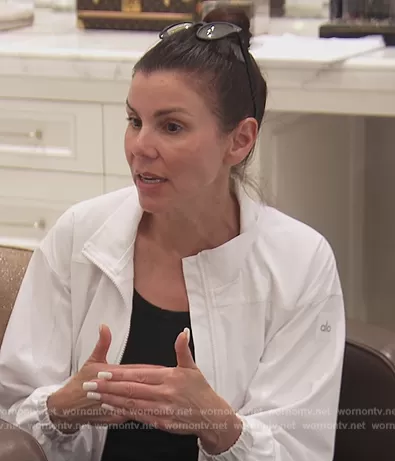 Heather Dubrow on The Real Housewives of Orange County on Bravo was spotted wearing this white zip jacket on The Real Housewives of Orange County on episode 'Loose Lips and Relationships' (17x09) in Aug 2023. Heather's Jacket is the Clubhouse Jacket by Alo Yoga.