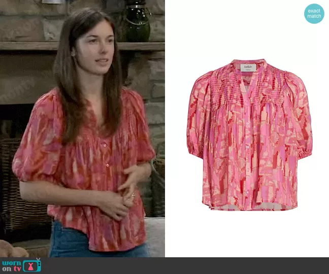 Willow Tait (played by Katelyn MacMullen) on General Hospital on ABC was spotted wearing this pink printed top on General Hospital on Aug 04 2023's episode. Willow's Top is the Teodor Top by ba&sh .