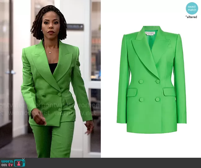 Andrea Barnes (played by Kj Smith) on Tyler Perrys Sistas on BET was spotted wearing this green suit on Tyler Perrys Sistas on episode 'The Aftermath' (6x10) in Aug 2023. Andi's Jacket is the Wool & Mohair Fitted Blazer by Alexander McQueen . Andi's Pants is the High-Rise Straight-Leg Cigarette Trousers by Alexander McQueen.