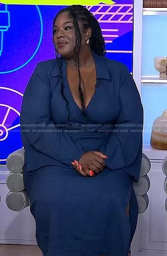 on Today on NBC was spotted wearing this blue wrap dress on Today on Aug 04 2023's episode. 's Dress is the Flute Sleeve Collared Wrap Midi Dress with gathers in dark blue by Asos.