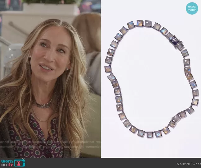 Carrie Bradshaw (played by Sarah Jessica Parker) on And Just Like That on HBO was spotted wearing this tile necklace on And Just Like That on episode 'A Hundred Years Ago' (2x08) in Aug 2023. Carrie's Necklace is the Large Tile Rivière Necklace by Nak Armstrong.