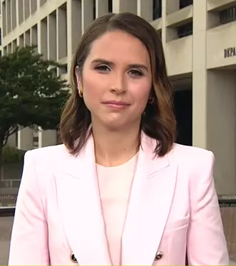 Elizabeth Schulze on Good Morning America on ABC was spotted wearing this pink double breasted blazer on Good Morning America on Aug 04 2023's episode. Elizabeth's Jacket is the Tailored Double Breasted Blazer in Pink by Zara.