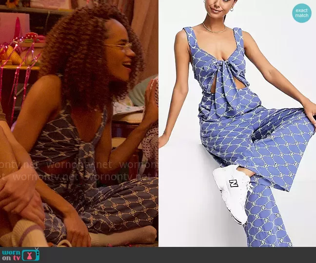 Elle Argent (played by Yasmin Finney) on Heartstopper on Netflix was spotted wearing this blue tie bust jumpsuit on Heartstopper on episode 'Truth / Dare' (2x06) in Aug 2023. Elle's Jumpsuit is the Jersey eyelet elasticated back jumpsuit in blue by ASOS Design.