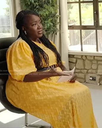 on Good Morning America on ABC was spotted wearing this yellow puff sleeve dress on Good Morning America on Aug 07 2023's episode. 's Dress is the Pleated Chevron Textured Dress with puff sleeve in orange by Asos Curve.