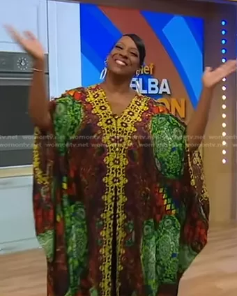 on Good Morning America on ABC was spotted wearing this multicolor printed caftan on Good Morning America on Aug 07 2023's episode. 's Caftan is the Zehra Goddess Kaftan by Sai Sankoh.