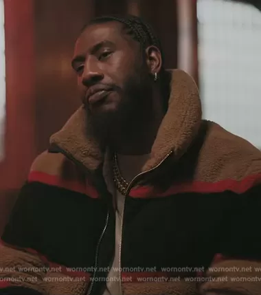 (played by Iman Shumpert) on The Chi on ShowTime was spotted wearing this teddy stripe jacket on The Chi on episode 'New Chi City' (6x01) in Aug 2023. 's Jacket is the Bradfield Jacket by Burberry.