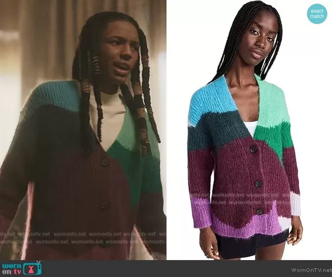 Jake (played by Michael Epps) on The Chi on ShowTime was spotted wearing this colorblock knit cardigan on The Chi on episode 'New Chi City' (6x01) in Aug 2023. Jake's Sweater is the Intarsia Wave Cardigan by Vince.