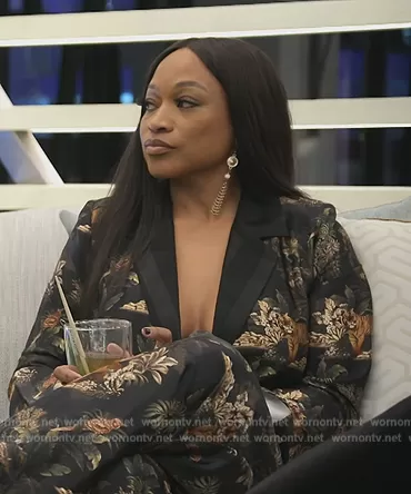 Monyetta on The Real Housewives of Atlanta on Bravo was spotted wearing this black floral print blazer and pants on The Real Housewives of Atlanta on episode 'Sex, Lies and Video-Phones' (15x12) in Jul 2023. 's Robe is the Ciara Robe by L'Agence . 's Pants is the Ivy Wide Leg Pants by L'Agence . 's Bag is the Lambskin Intrecciato Padded Chain Cassette Crossbody Bag by Bottega Veneta.