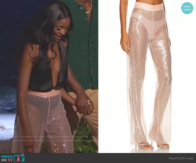 Charity Lawson on The Bachelorette on ABC was spotted wearing this pink sequin sheer pants on The Bachelorette on episode 'Week 7' (20x07) in Aug 2023. Charity's Pants is the Patara Pants in coral blush by New Arrivals by Ilkyaz Ozel.
