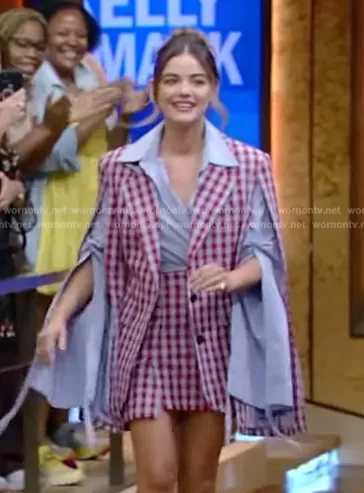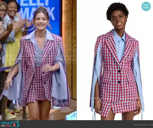 on Live with Kelly and Mark on Disney ABC Home Entertainment was spotted wearing this check print layered jacket and skirt on Live with Kelly and Mark on Aug 08 2023's episode. 's Jacket is the Check Tied Backsleeve Jacket by Monse . 's Skirt is the Asymmetric checked cotton-blend twill mini skirt by Monse.