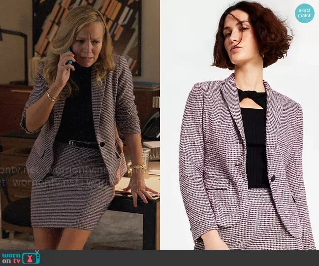 Lorna Crane (played by Becki Newton) on The Lincoln Lawyer on Netflix was spotted wearing this pink tweed blazer and skirt suit on The Lincoln Lawyer on episode 'Bury Your Past' (2x10) in Aug 2023. Lorna's Jacket is the Single-Button Long Sleeve Blazer by Bar III . Lorna's Skirt is the Multi Tweed Mini Skirt by Bar III . Lorna's Earrings is the Small Open Oval Hoop Earrings by All Saints.