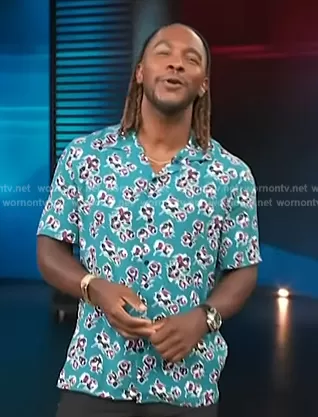 Scott Evans on Access Hollywood on NBC was spotted wearing this blue floral print shirt on Access Hollywood on Aug 09 2023's episode. Scott's Shirt is the Graphic-print short-sleeve woven shirt by The Kooples.