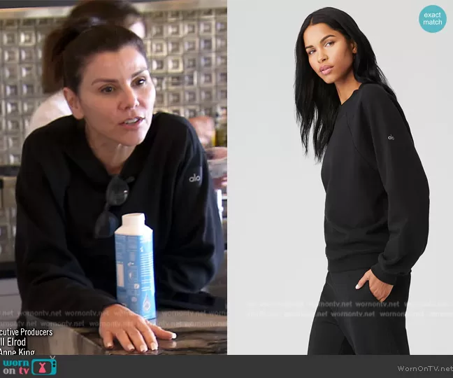 Heather Dubrow on The Real Housewives of Orange County on Bravo was spotted wearing this black alo sweatshirt on The Real Housewives of Orange County on episode 'A Doppelgänger Disaster' (17x10) in Aug 2023. Heather's Sweater is the Heavy Weight Free Time Crew Pullover by Alo Yoga.