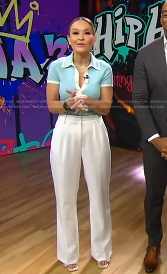 Eva Pilgrim on Good Morning America on ABC was spotted wearing this light blue polo top and white pants on Good Morning America on Aug 11 2023's episode. Eva's Top is the Pia Rib-Knit Polo Shirt by Alice + Olivia . Eva's Pants is the The Favorite Pants by Favorite Daughter.